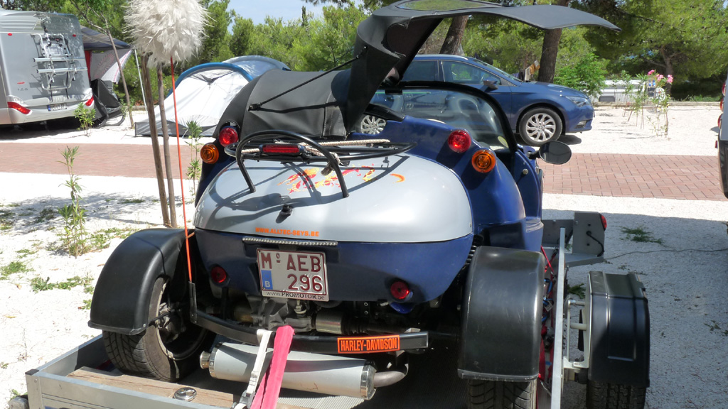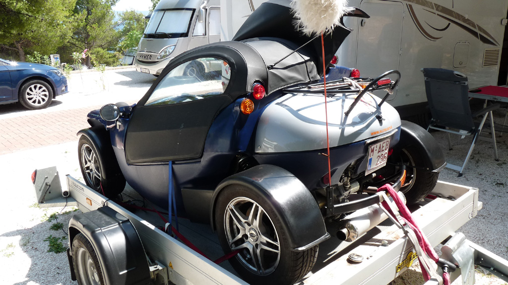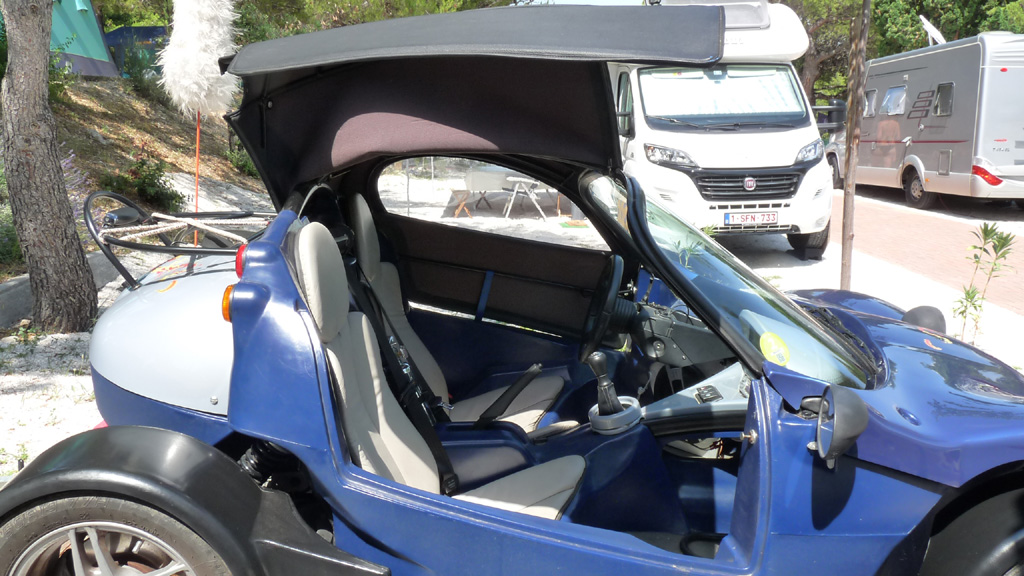 Neen, niet alles is rozengeur en maneschijn; Het voertuig heeft geen koffer of handschoenkastje, iets opbergen is er niet bij. Om in en uit te stappen, ben je best lenig. Een fluo vlagje is een must. Je moet voor je vertrek beslissen: met of zonder dak, meenemen of wegbergen kan niet.