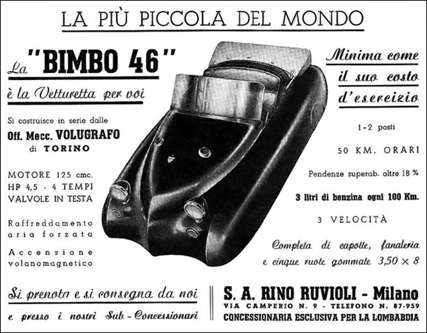 Belmondo ontwikkelde het voertuig genaamd Volugrafo Bimbo 46, in november 1945 en geproduceerd vanaf het voorjaar van 1946. De productie eindigde in 1948 nadat er ongeveer 60 waren gemaakt. Het voertuig had een buizenframe en een smal spoor van slechts 78 cm. De volledig ingekapselde voorwielen werden geleid op dubbele draagarmen van gelijke lengte en de besturing vanaf het grote stuurwiel dat iets links van het midden was geplaatst, werd overgebracht door een ketting. Het open, deurloze lichaam bevatte een bankje waarop twee mensen in geval van nood naast elkaar konden zitten. Het voertuig was 2,4 meter lang en 90 centimeter hoog. Er was een dunne stoffen bovenkant zonder zijpanelen als bescherming tegen weersinvloeden. Hij werd aangedreven door een luchtgekoelde eencilinder 125cc-motor van 5 pk (3,7 kW) die het linkerachterwiel aandreef. Er was ook een sportversie uitgerust met een tweede aandrijving op het rechter achterwiel.