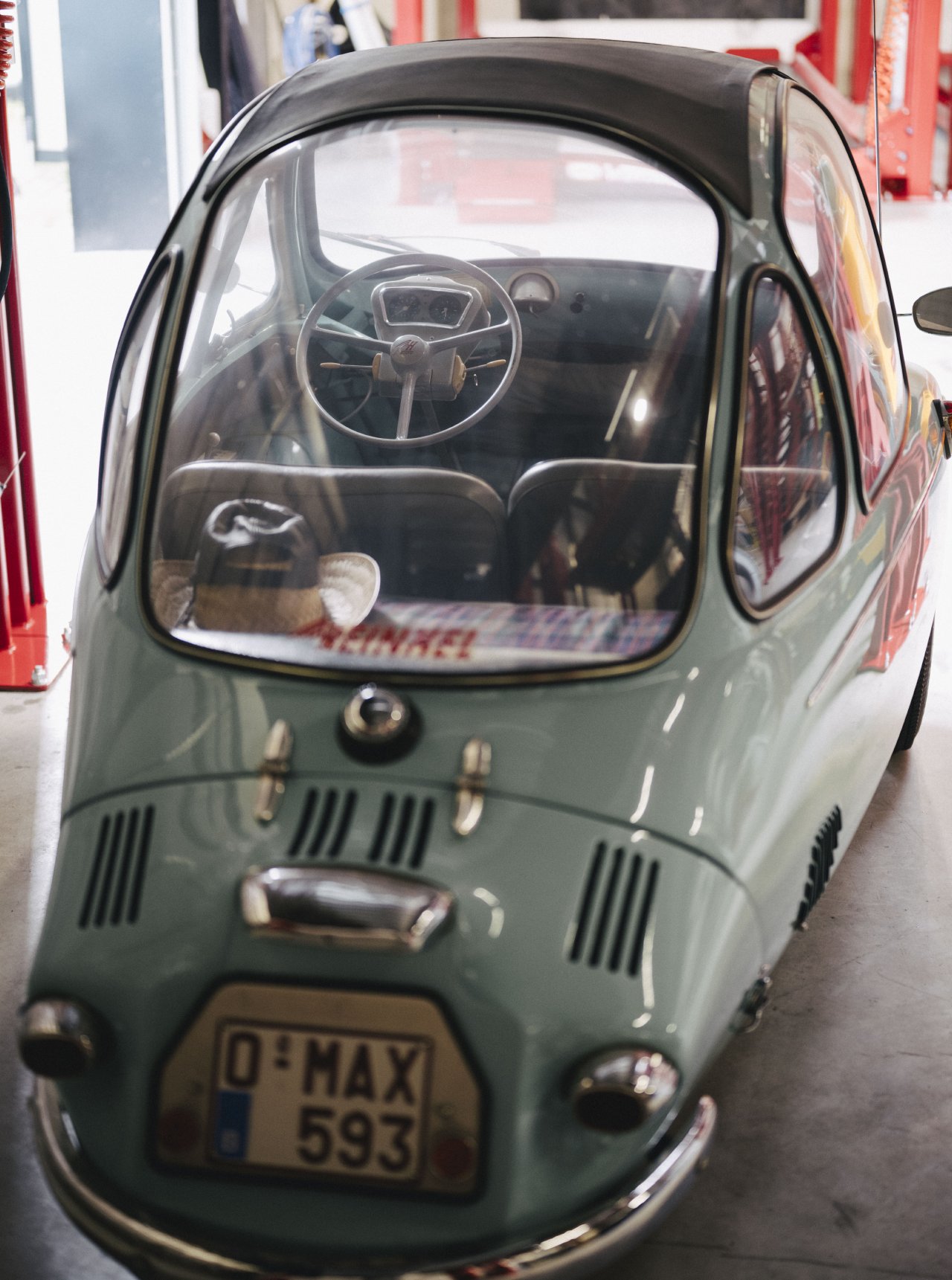 ‘De Isetta heeft BMW van de ondergang gered’, zegt hij. ‘Het concept werd uitgedokterd door de Italiaanse fabrikant van huishoudtoestellen Iso. De enige deur zit vooraan in het autootje en wordt weleens vergeleken met die van een koelkast, hun belangrijkste product. In 1954 kocht BMW een licentie. Het gebruikte de motor van een motorfiets. In Frankrijk was er de Velam Isetta, met een andere motor.’